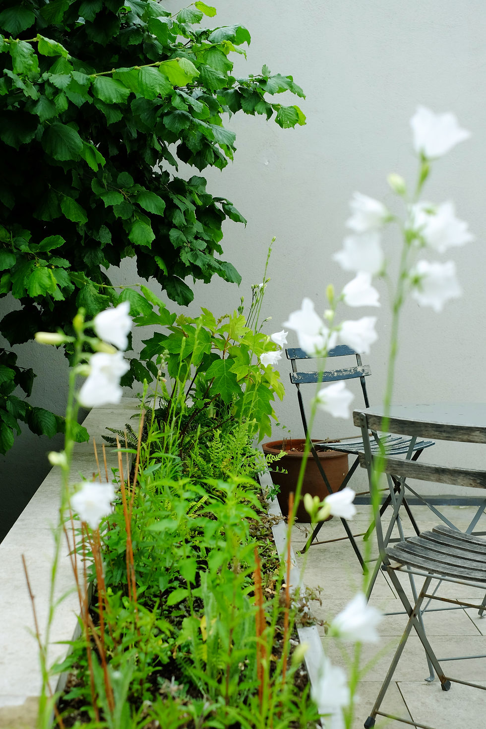 A long, rectangular planter in stone was to be filled with plants and shrubs. The planter sits on top of a roof-terrace, overlooking another part of the garden. Loose, wavy flowers don't block the view but add some colour and movement to the terrace. The long planter varies from full sun to a more shaded spot, with flowers and plants varying along the way.